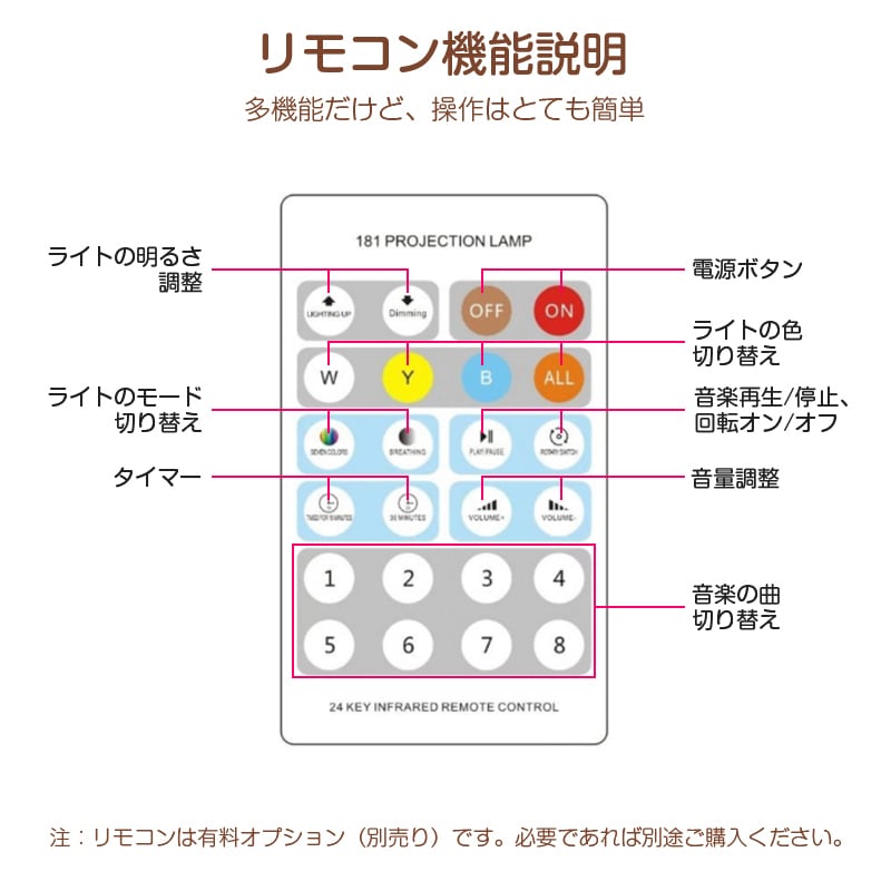 明るさ調整やタイマーオフ機能に、リモコン(別売)による遠隔操作も対応。