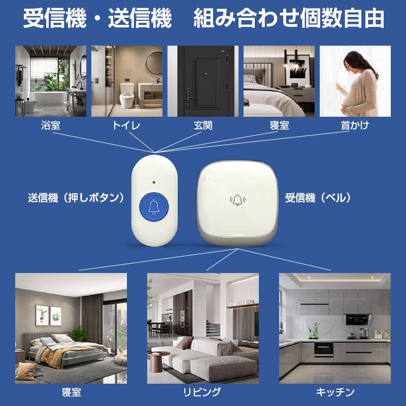 内容物:受信機(ベル)×1、送信機(ボタン)×1、ストラップ、両面テープ、ネジ、説明書,