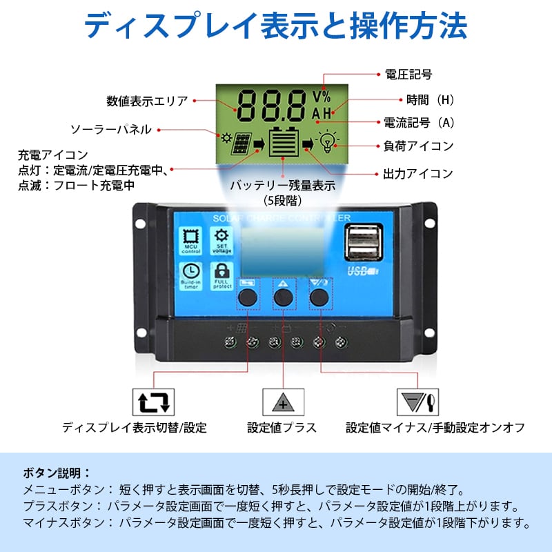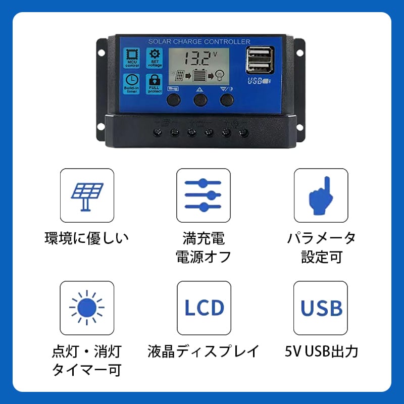 【重要】本商品はソーラーパネル用の「充電制御装置」のみです。ソーラーパネル本体とセット販売ではありません。ソーラーパネルは付属しておりません。予めご了承ください。