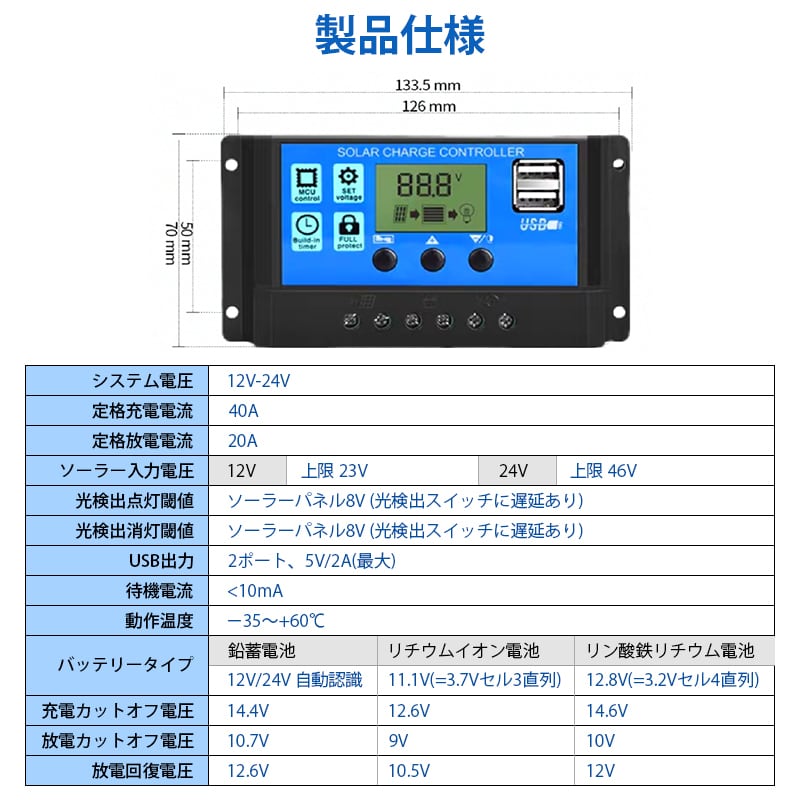 ソーラーチャージコントローラー 40A ソーラーチャージャー 液晶画面 太陽光発電 ソーラーパネル バッテリー 12V 24V 兼用 リチウム 鉛蓄 電池 USB5V出力ポート
