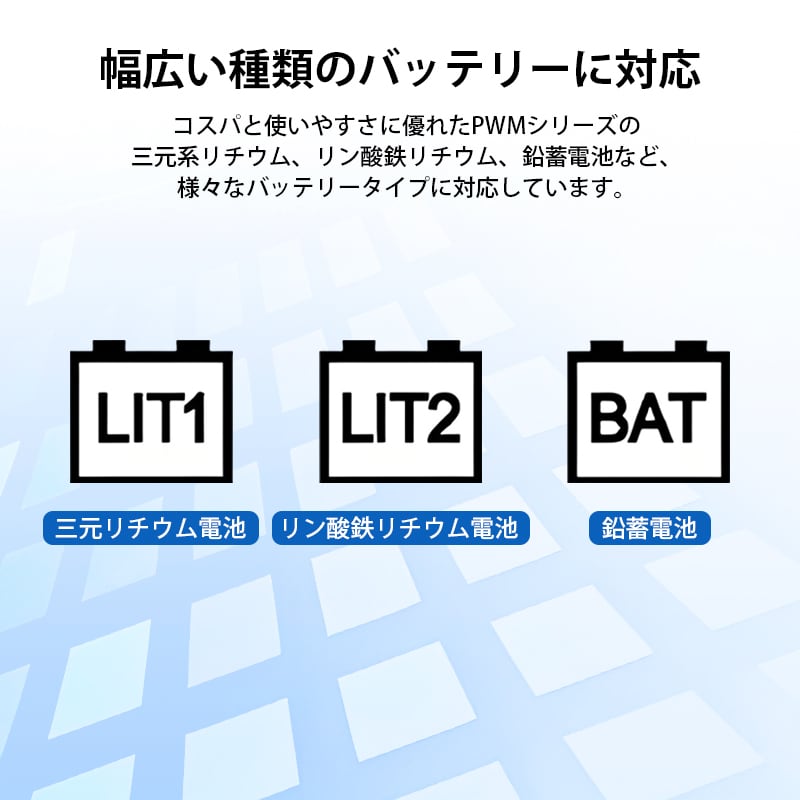 対応バッテリー:鉛蓄電池、リチウムイオン、リン酸鉄リチウムなど,