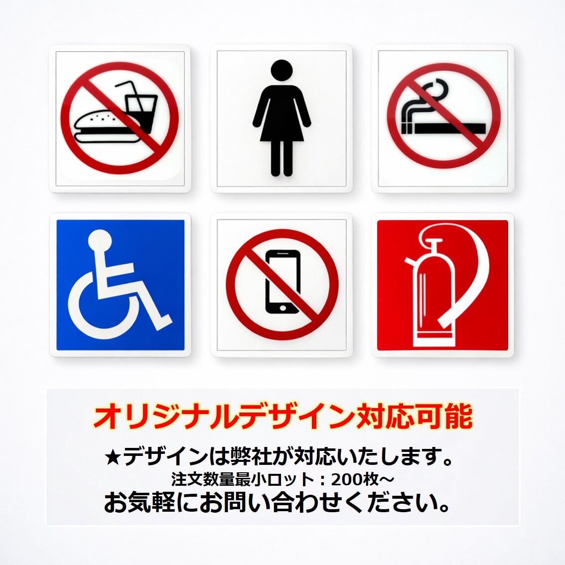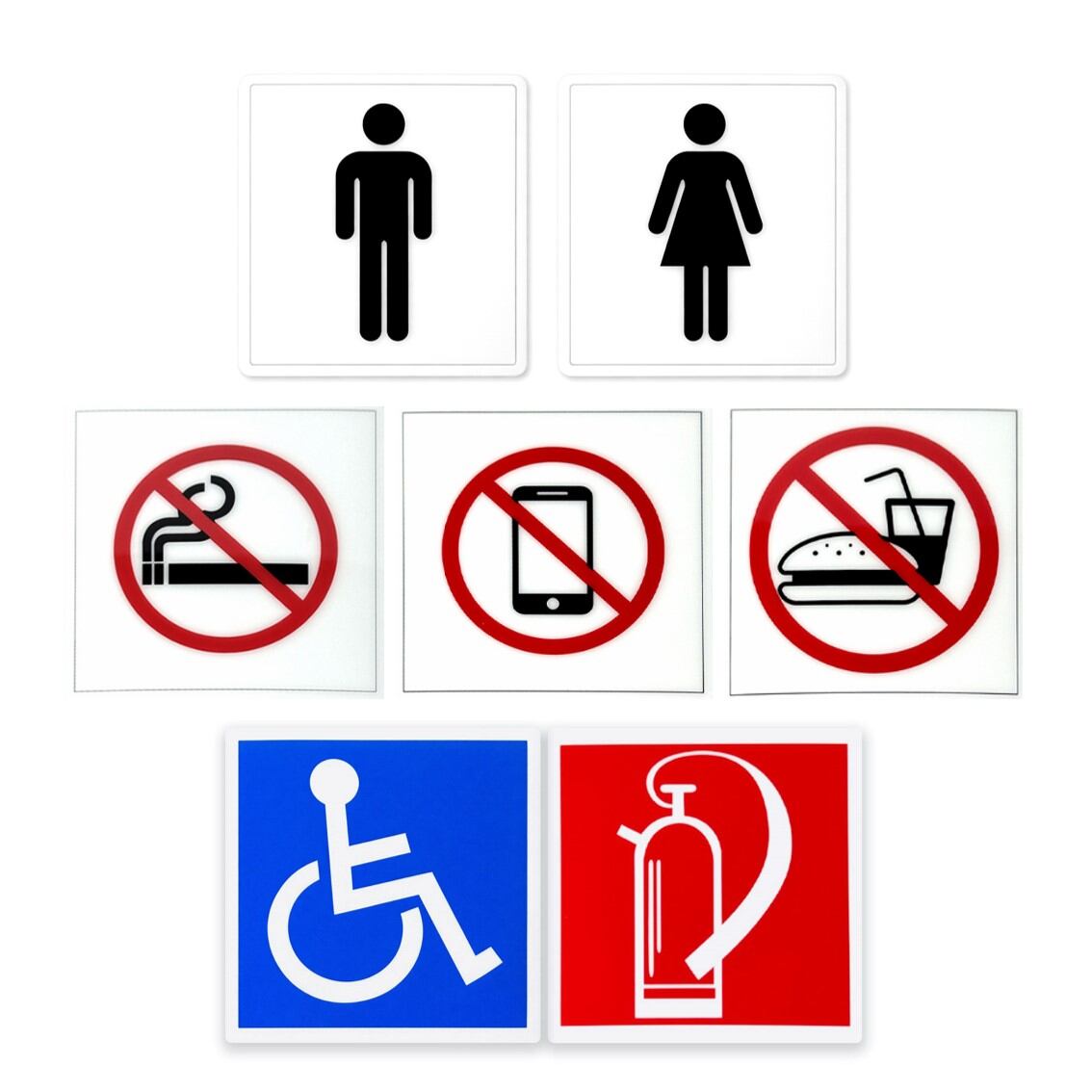 デザイン:男女トイレ、車椅子、消火器、禁煙、携帯電話禁止、飲食禁止,