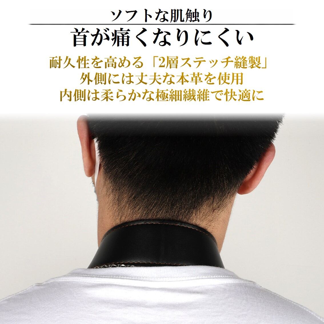 幅広の本革パッドと裏面の柔らかいクッション素材が、首元の痛みを軽減します。
