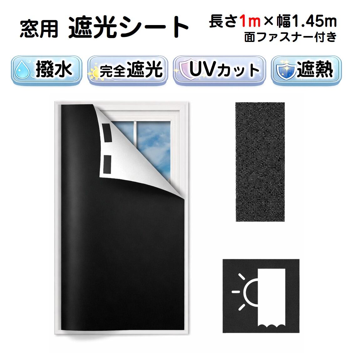 遮光シート 長さ1m 幅1.45m 完全遮光100% 窓ガラス 窓 遮熱 断熱 UVカット 紫外線対策 日よけ 防水 夏 省エネ 貼るだけ 面ファスナー 黒 目隠し 暗幕 寝室 防犯 | tsmobile