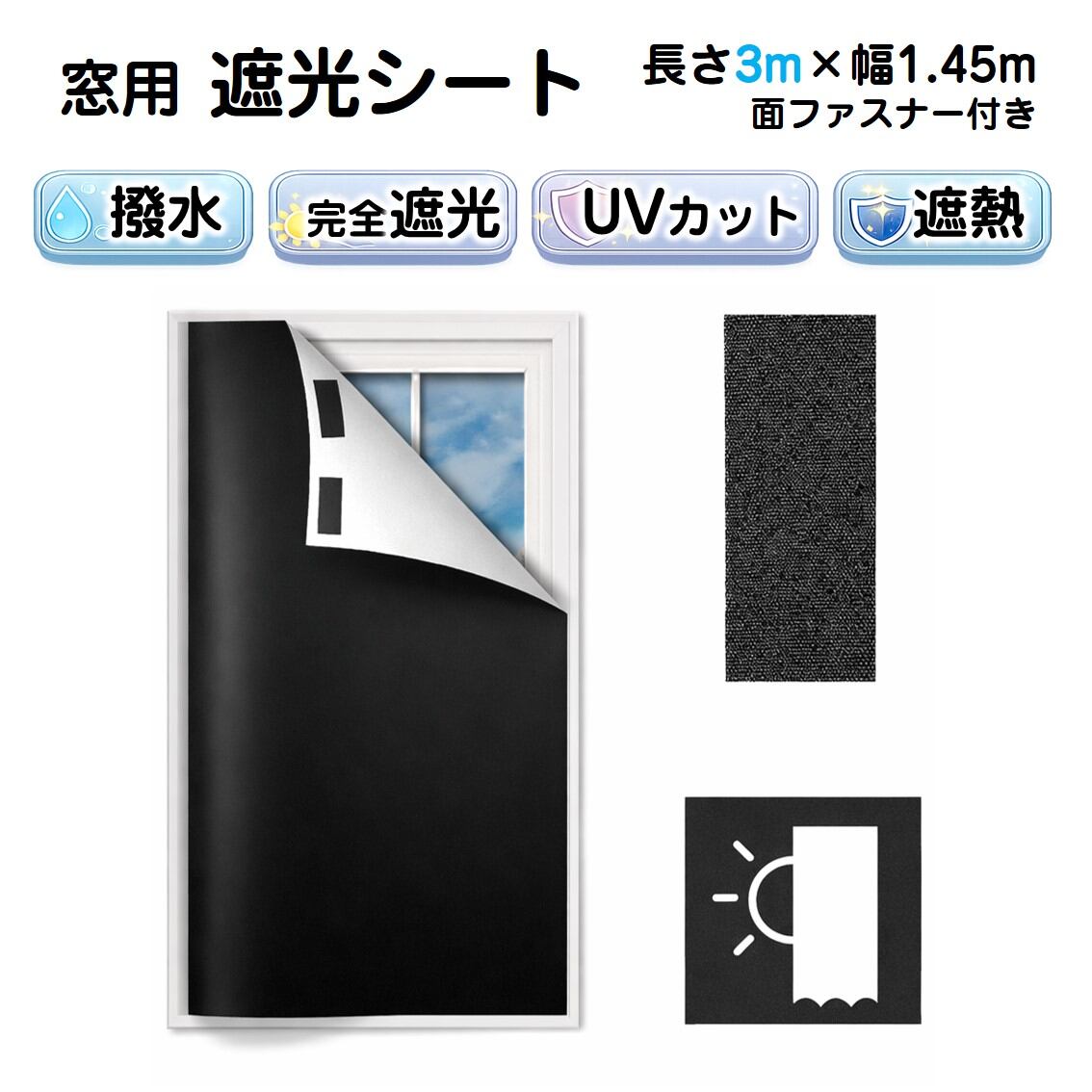 遮光シート 長さ3m 幅1.45m 完全遮光100% 窓ガラス 窓 遮熱 断熱 UVカット 紫外線対策 日よけ 防水 夏 省エネ 貼るだけ 面ファスナー 黒 目隠し 暗幕 寝室 防犯 | tsmobile