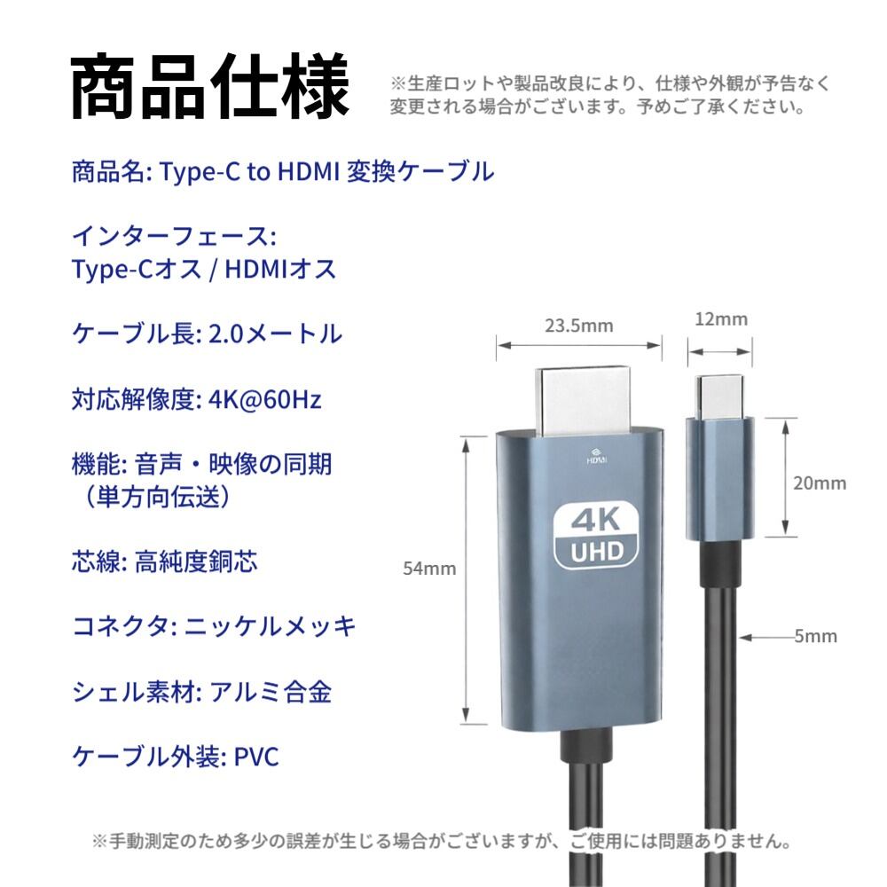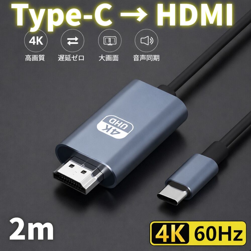 USB Type-C to HDMI 変換ケーブル 2m 4K/60Hz 高画質 設定不要 USB-C 変換アダプタ 単方向伝送 接続 PC スマホ カーナビ テレビ モニター ディスプレイ 映像出力