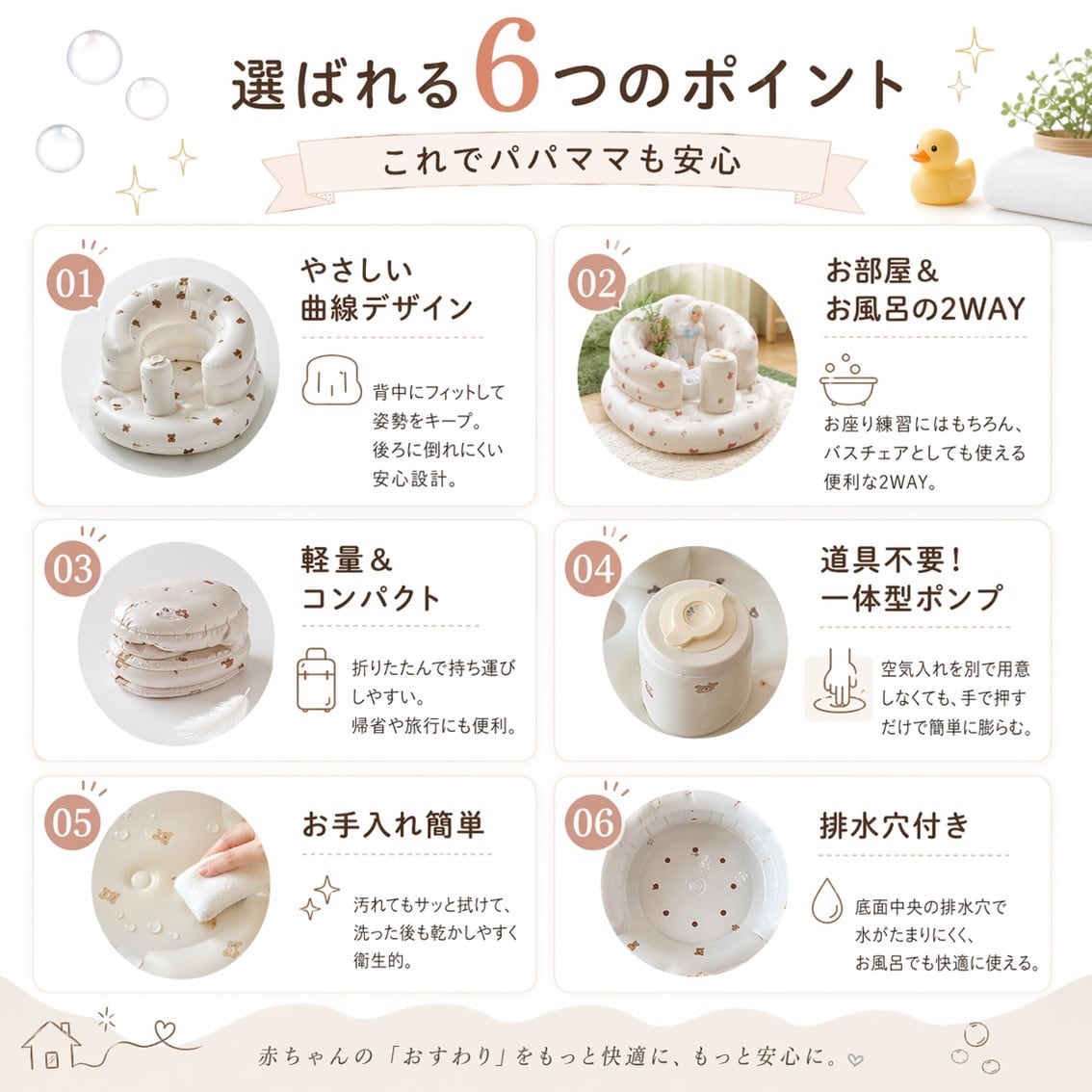赤ちゃんのお座り練習やお風呂タイムを、もっとラクにしたいママとパパへ。