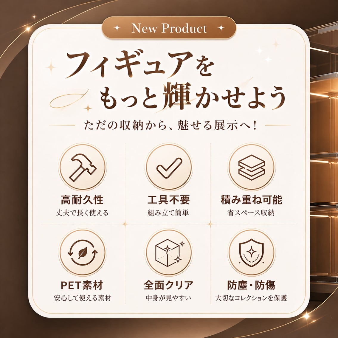 高い透明度を誇る素材を採用しており、自慢のフィギュアを全方位からクリアに鑑賞。