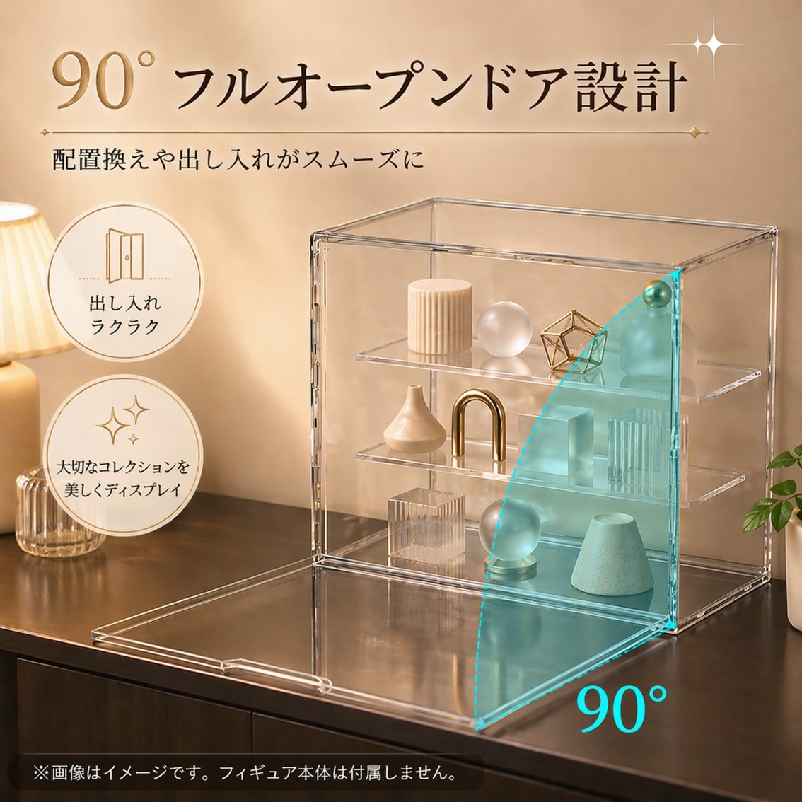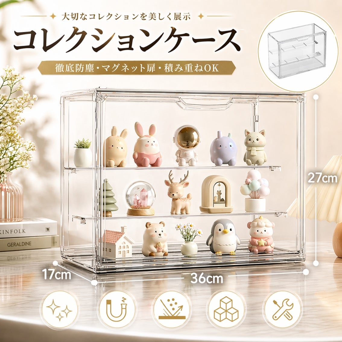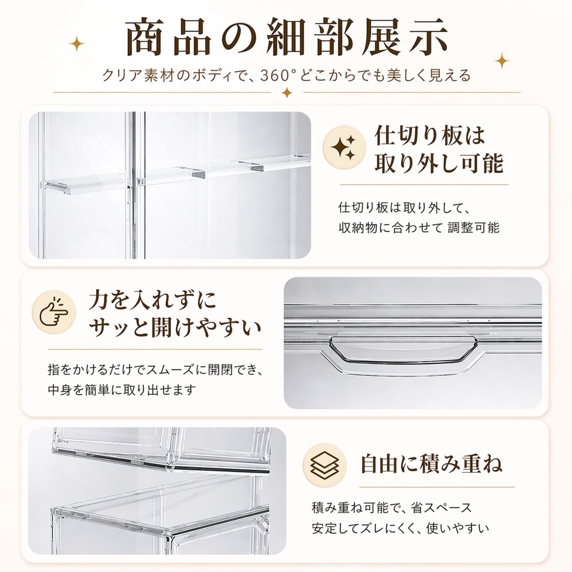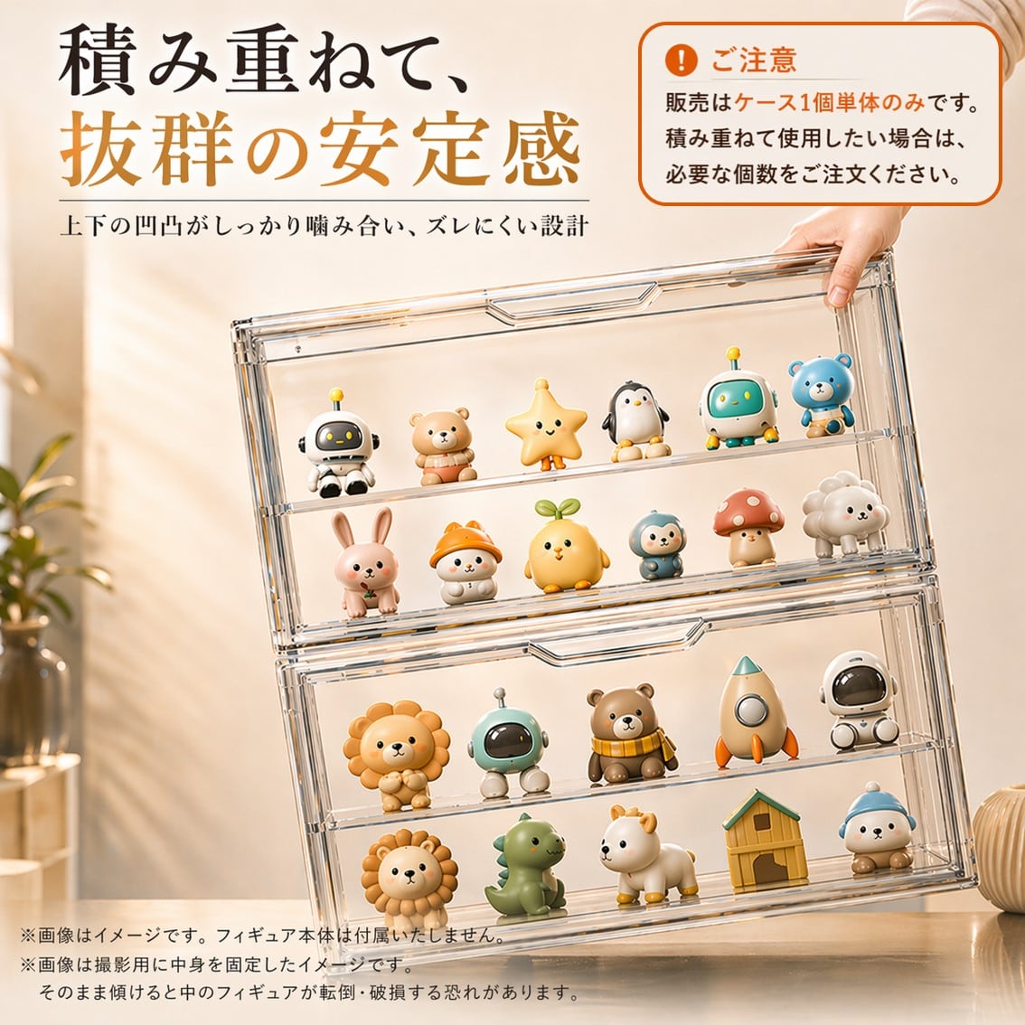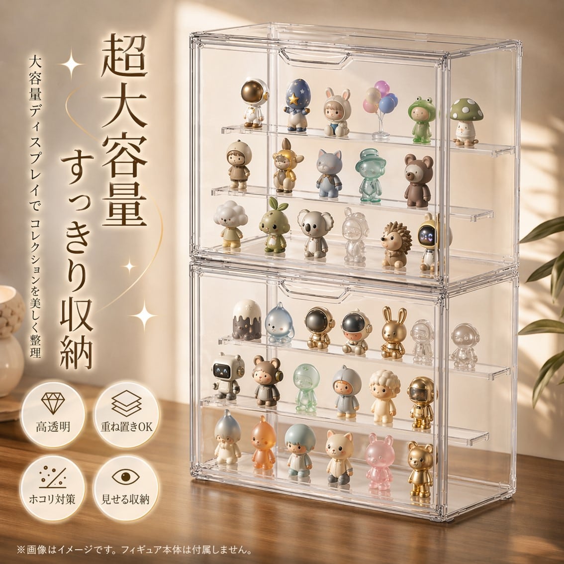 スタッキング設計により、増え続けるグッズも省スペースで美しくまとめられます。