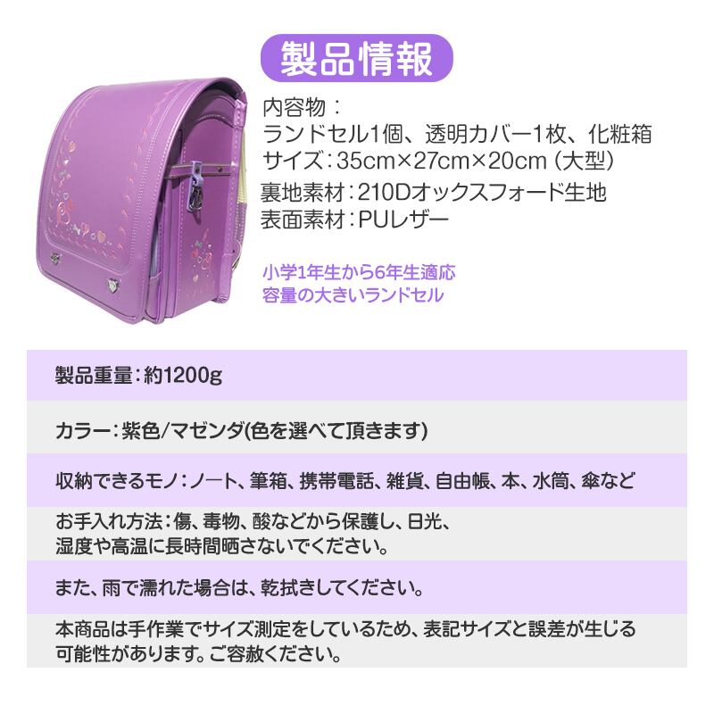 ランドセル 刺繍 女の子 可愛い 軽い 小学生 1年生から6年生 入学祝い 入学準備 リュック 撥水 通学バッグ ハート イラスト おしゃれ 色選べる 人気 流行り パープル 紫 ピンク マゼンタ 新品 未使用品 | tsmobile