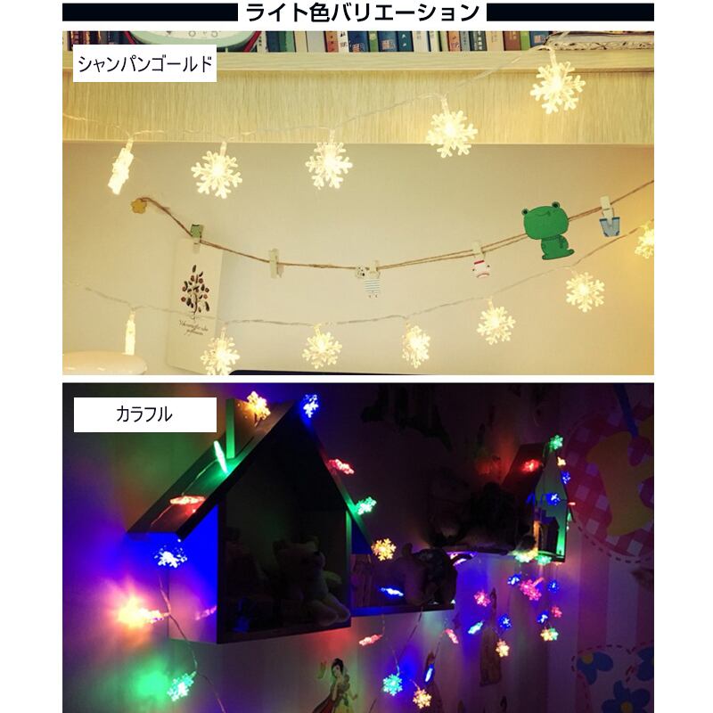 特徴:コンセントタイプは2本繋いて延長可能。雪の結晶の花模様で、ロマンチックな雰囲気。