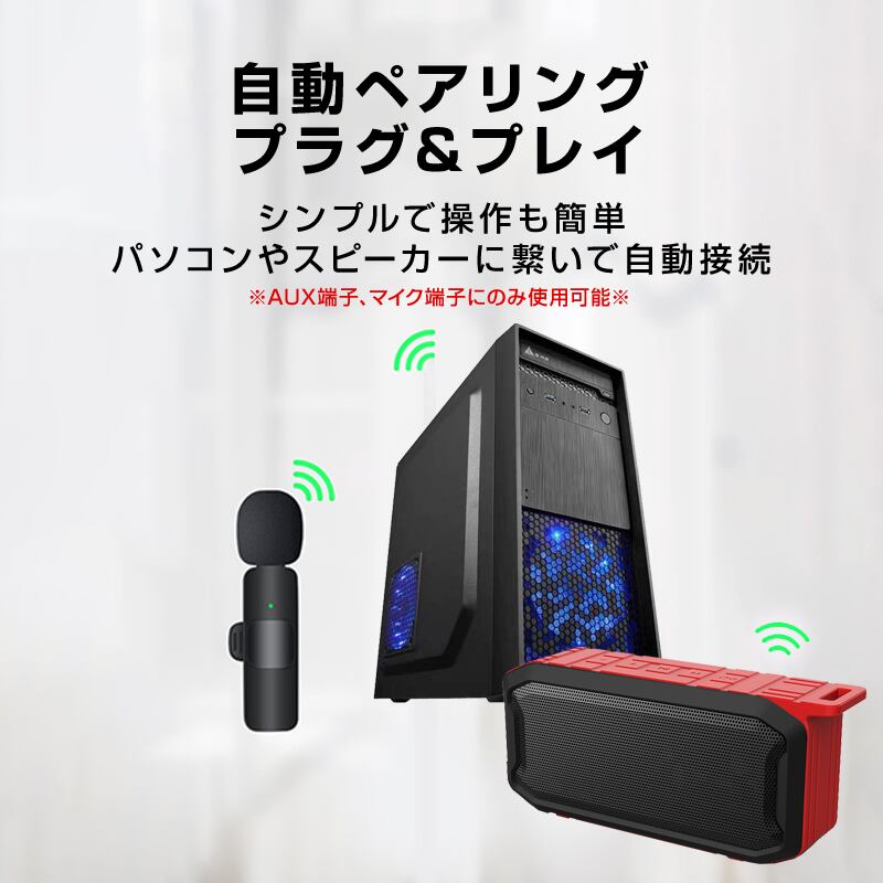マイク2個セットだから、2人実況や配信に便利。アプリダウンロードやBluetooth接続不要、自動ペアリング。幅広い機器に使用可能で、AUX端子またはマイク端子専用。PC、スピーカー、アンプ、一眼レフ、プロジェクター等と互換性有り。軽量で便利なクリップ式ワイヤレスマイク。内蔵チップにより高性能ノイズキャンセル搭載。授業や会議に便利な360°最大20mの広範囲集音。ニコニコ動画、InstagramやYoutubeにTiktok等のSNSや配信アプリ対応。カラオケ、Vlog、ライブストリーミングに最適。商品仕様:端子:3.5mm,寸法(幅*高さ*奥行):マイク:約15.0*63.0*10.0mm、レシーバー:約21.0*65.0*12.5mm,重量:マイク:約7g、レシーバー:約10g,材質:ABS他,内蔵バッテリー容量:50-100mAh,信号対雑音比:<70db,応答周波数:20Hz-20KHz,動作時間:約3-6時間,内容物:本体(マイクロフォントランスミッター*2、レシーバー*1)、充電用ケーブル*1、日本語取扱説明書,※本商品の仕様及び外観等は予告なく変更する場合がございます。※本商品は音声の送信のみ対応しています。音声の受信、または、映像の送受信には対応しておりません。※ヘッドセット端子では使用できません。