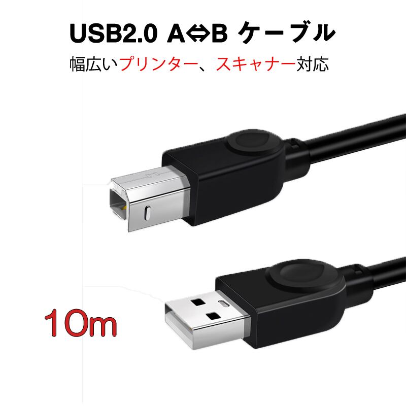 プリンター用USB-AtoBケーブル 10m USB2.0 コード10メートル USBAオスtoメUSBBオス データ転送 パソコン スキャナー 複合機 有線接続 コネクタ キャノン 黒色 | tsmobile